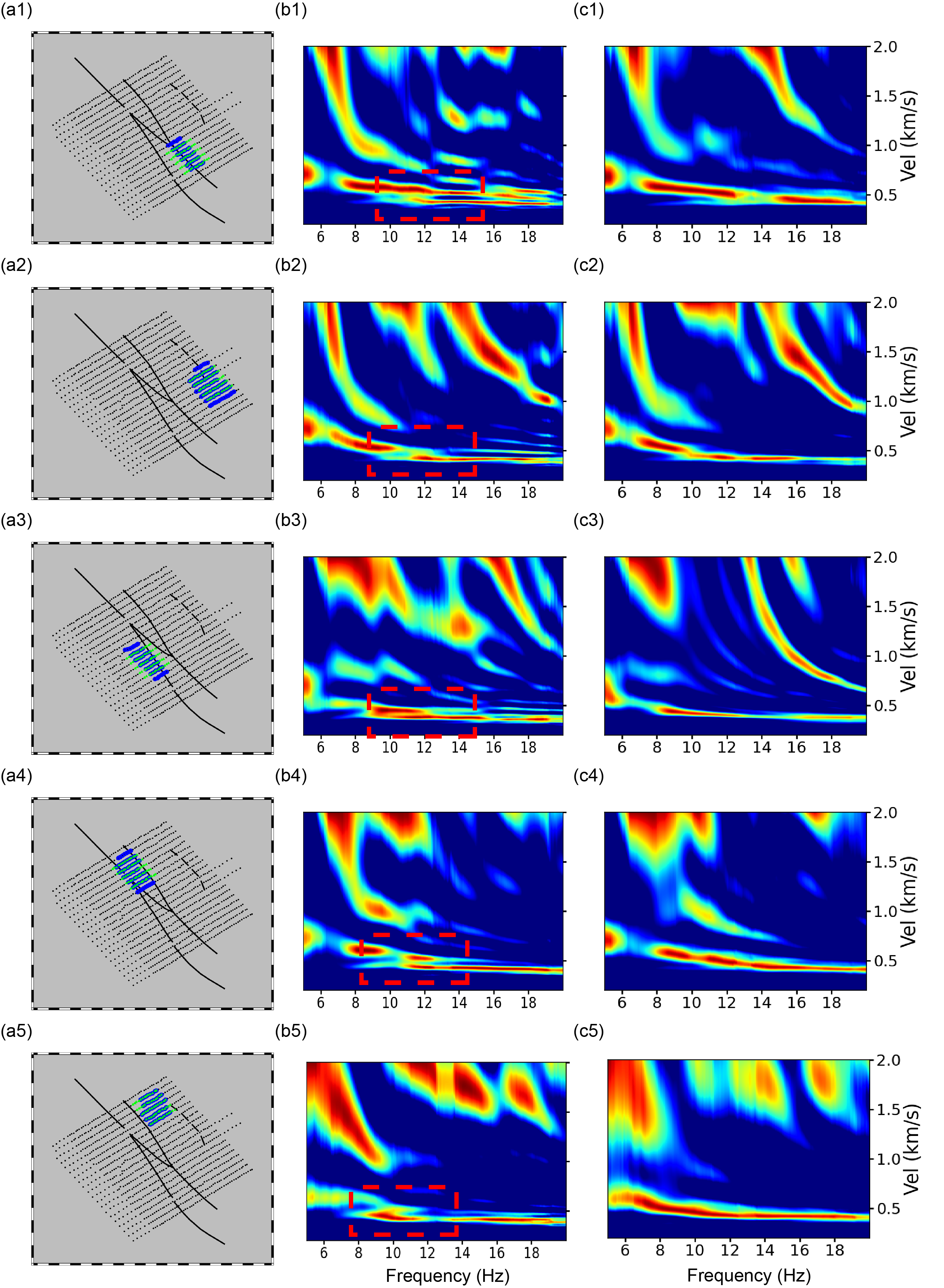 Here, we demonstrate the effectiveness of the FJ-PST by comparing it to the dispersion spectrogram calculated by the traditional F-J method in a dense nodal array deplyed at San Jacinto Fault Zone (Ben-Zion et al., 2015). As indicated in Figure 4, the entire array suffered from extensive and severe fundamental mode bifurcation on the dispersion spectrogram calculated by the traditional F-J method, while the FJ-PST successfully detected the boundaries and adaptively adjusted the subarrays to mitigate this issue.