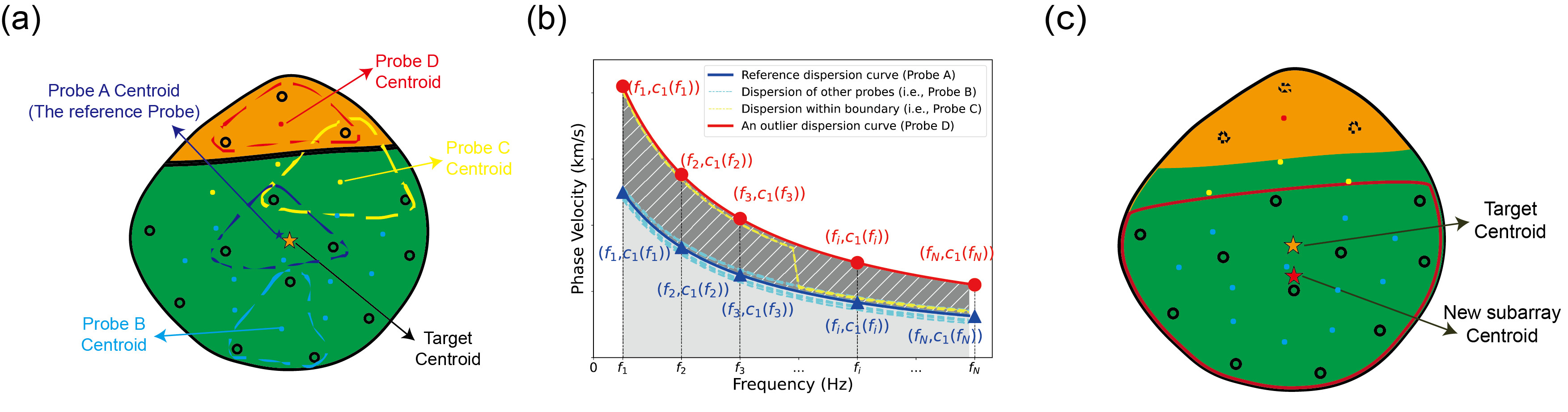 - First, the shape and size of “targets” and “probes” should be established, as shown in Figure 3(a). A “target” refers to a relatively large subarray that is usually directly used for dispersion extraction in the traditional workflow of the F-J method. The shape of targets and probes can be tuned to the array distribution, such as a circle or square. Appropriate sizes of targets need to be tested to produce a better dispersion spectrogram, the same as previous applications usually do. A helpful starting point is applying the F-J method to the entire array, with the first bifurcation revealed by the dispersion spectrogram indicating the lower limit of the resolvable frequency range. Targets are fixed-shape arrays with sufficient aperture to capture this minimum frequency band \((f_{min})\). The dispersion at f_min can be accurately estimated by the F-J method ddependingon the aperture \((r_{max})\) of the array, which is considered at least half of the wavelength (\(\lambda_{max}\)) at the \(f_{min}\) in this study: