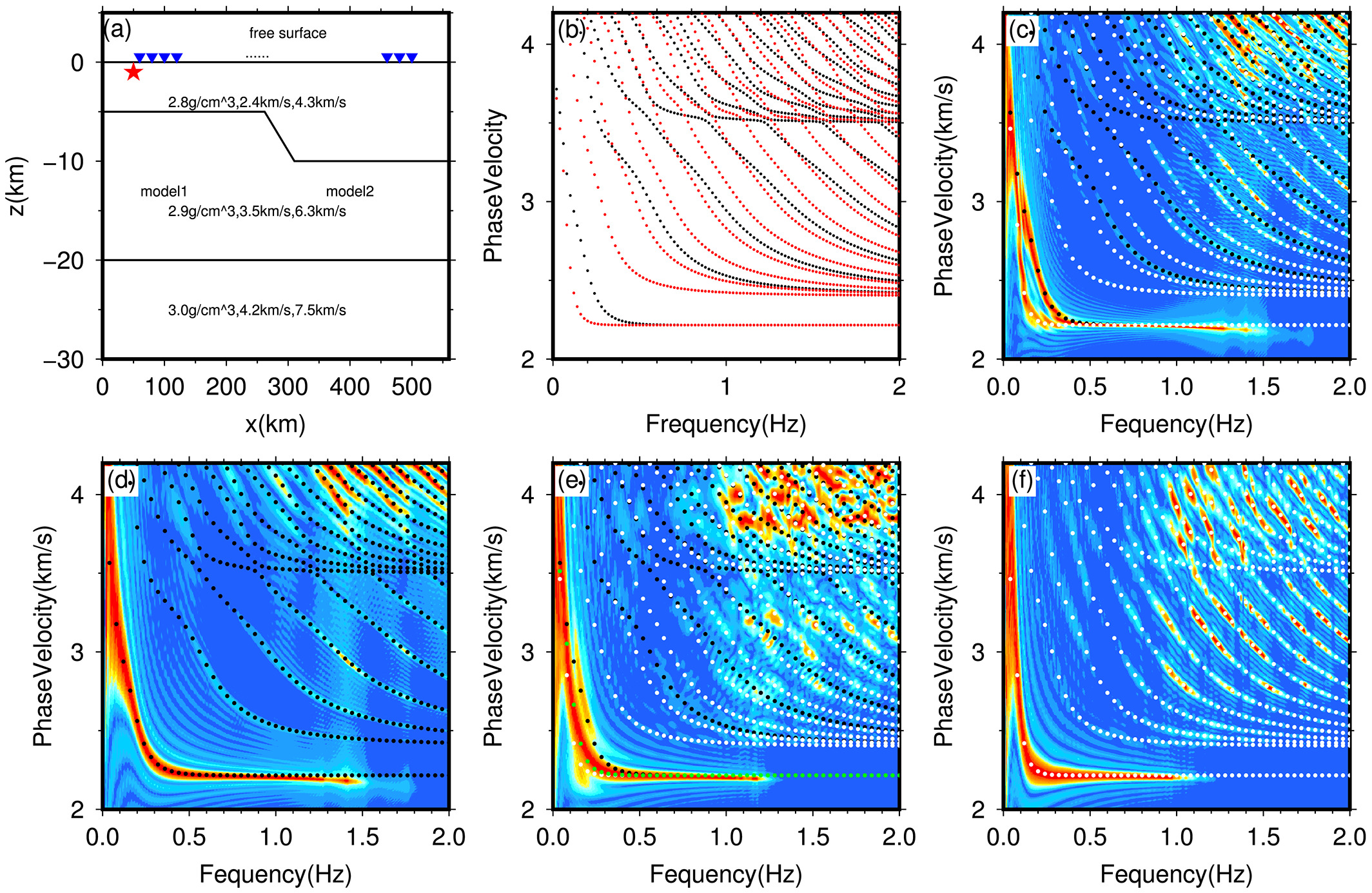 \[I(\omega,k) = \int_0^{+\infty}\tilde{C}(\omega,k)\cdot J_0(kr)rdr\tag{2}\label{eq2}\]Here, \(I(ω,c)\) represents the F-J spectrogram for a given angular frequency ω and velocity c. Under the assumption that the CCF approximates the imaginary part of the Green’s function in a flat multilayered elastic half-space, the Rayleigh wave dispersion curves can be extracted as peak values of \(I(\omega,c)\). However, the interal over interstational distance \(r\) makes this strategy an array-based method, which need a certain number of stations to extract one dispersion curves. And because under the assumption of using the axial symmetry of \(J_{0}\), it assumes that the coverage of an array should have a layered velocity structure .
