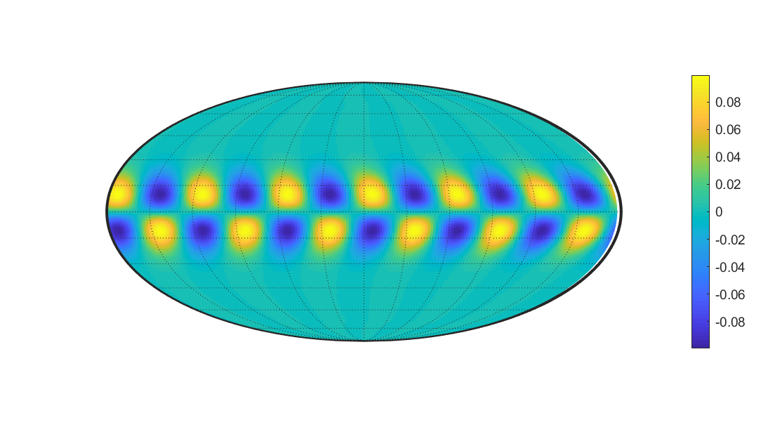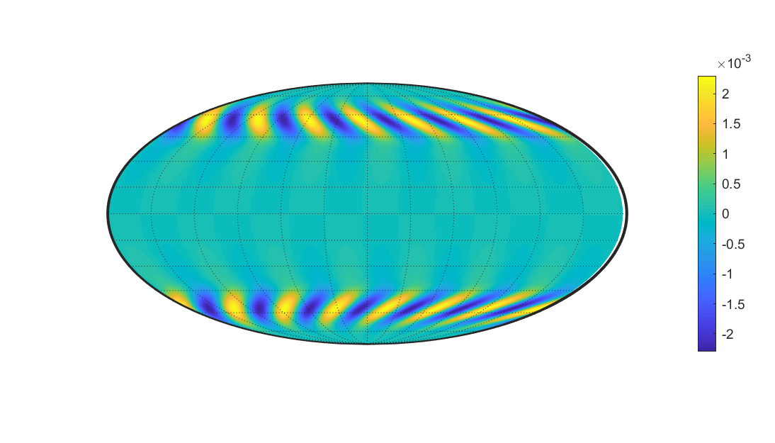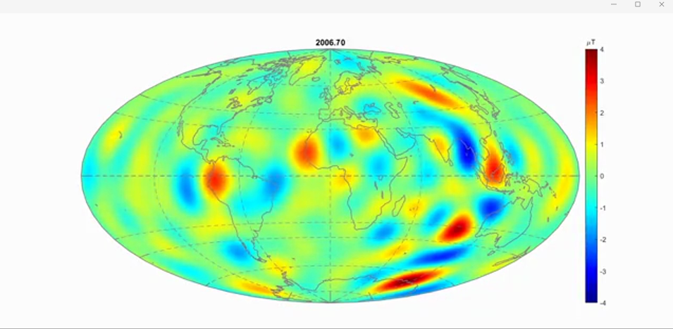 \[\left\{ \begin{aligned} \frac{\partial \vec{u}}{\partial t} + 2(\vec{\Omega} \times \vec{u}) &= -\frac{1}{\rho} \nabla p + \frac{1}{\rho \mu_0} (\nabla \times \vec{b}_0) \times \vec{B}_0 + \nu \nabla^2 \vec{u} - \alpha g \Theta r \hat{r} \\ \frac{\partial \vec{b}}{\partial t} &= \nabla \times (\vec{u} \times \vec{B}_0) + \eta \nabla^2 \vec{b} \\ \frac{\partial \Theta}{\partial t} + \vec{u} \cdot \nabla T(r) &= \kappa \nabla^2 \Theta \\ \end{aligned} \right.\]This study utilizes harmonic analysis to numerically model the linearized physical equations. By solving the corresponding eigenfunctions, we can simulate the theoretical geomagnetic variation patterns of different eigenmodes to match with the observations. Details of the governing equations and parameter selection can be found in (Lin & Ogilvie, 2017).